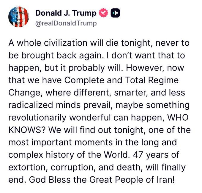 In the post, Trump described the possibility that “a whole civilization” could be lost, while also referencing “complete and total regime change” and expressing hope that a different outcome could emerge. The message quickly drew attention from policymakers and international observers due to its unusually stark tone and lack of accompanying official details.