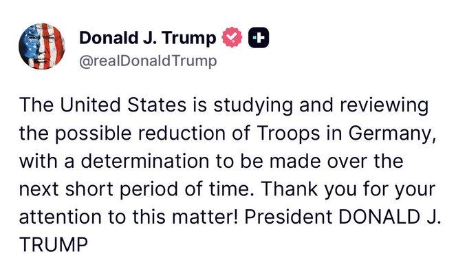 In a post on Truth Social, President Trump wrote, "The United States is studying and reviewing the possible reduction of Troops in Germany, with a determination to be made over the next short period of time." The statement came one day after Trump accused Merz of believing it was acceptable for Iran to possess a nuclear weapon.
